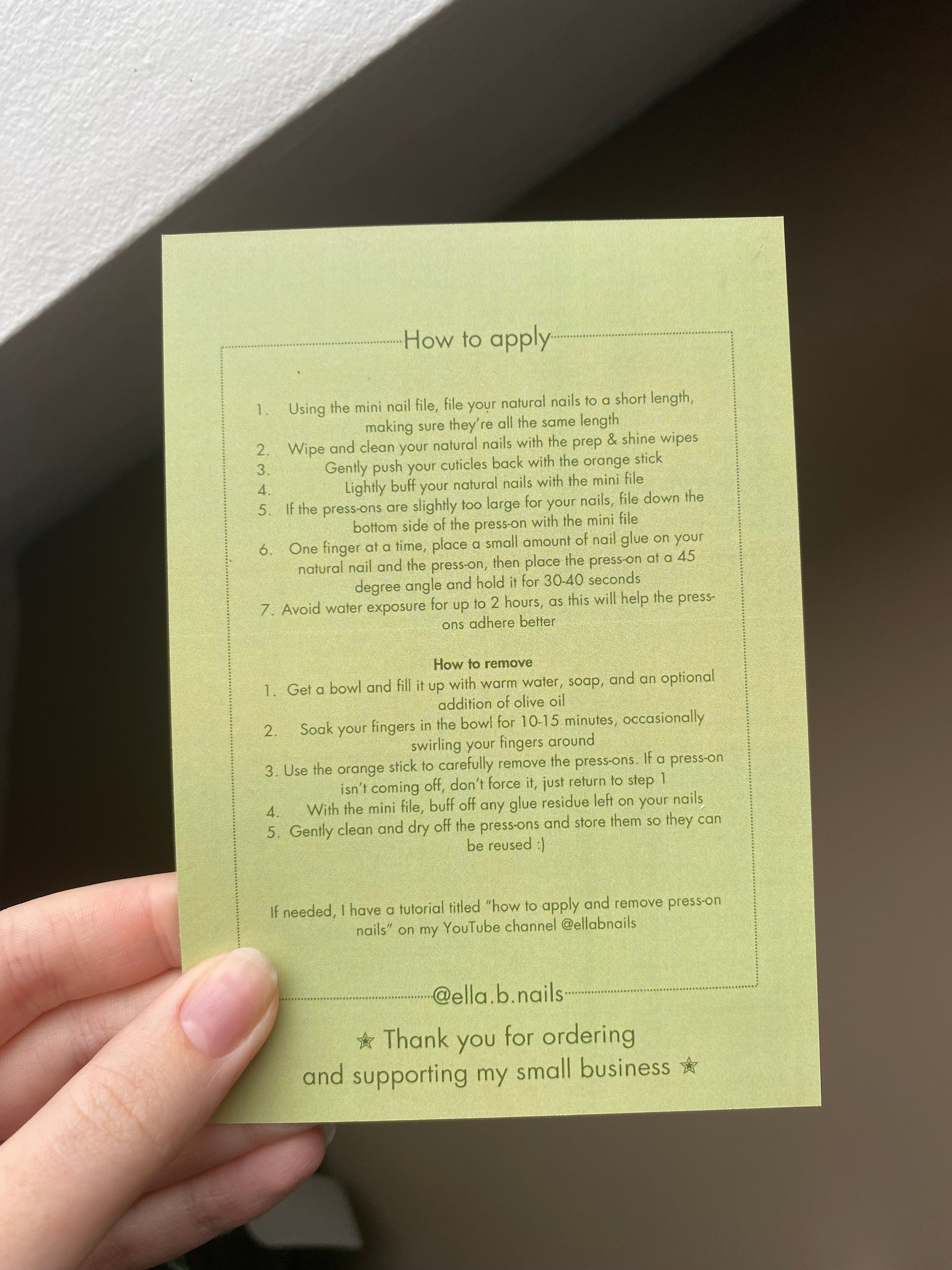 Please remember to measure your nail sizes carefully and multiple times, so you get the most accurate fit, I am not responsible for incorrect measurements and purchases cannot be refunded or returned. Also, keep in mind that there might be slight variations on sets as they're handmade.
