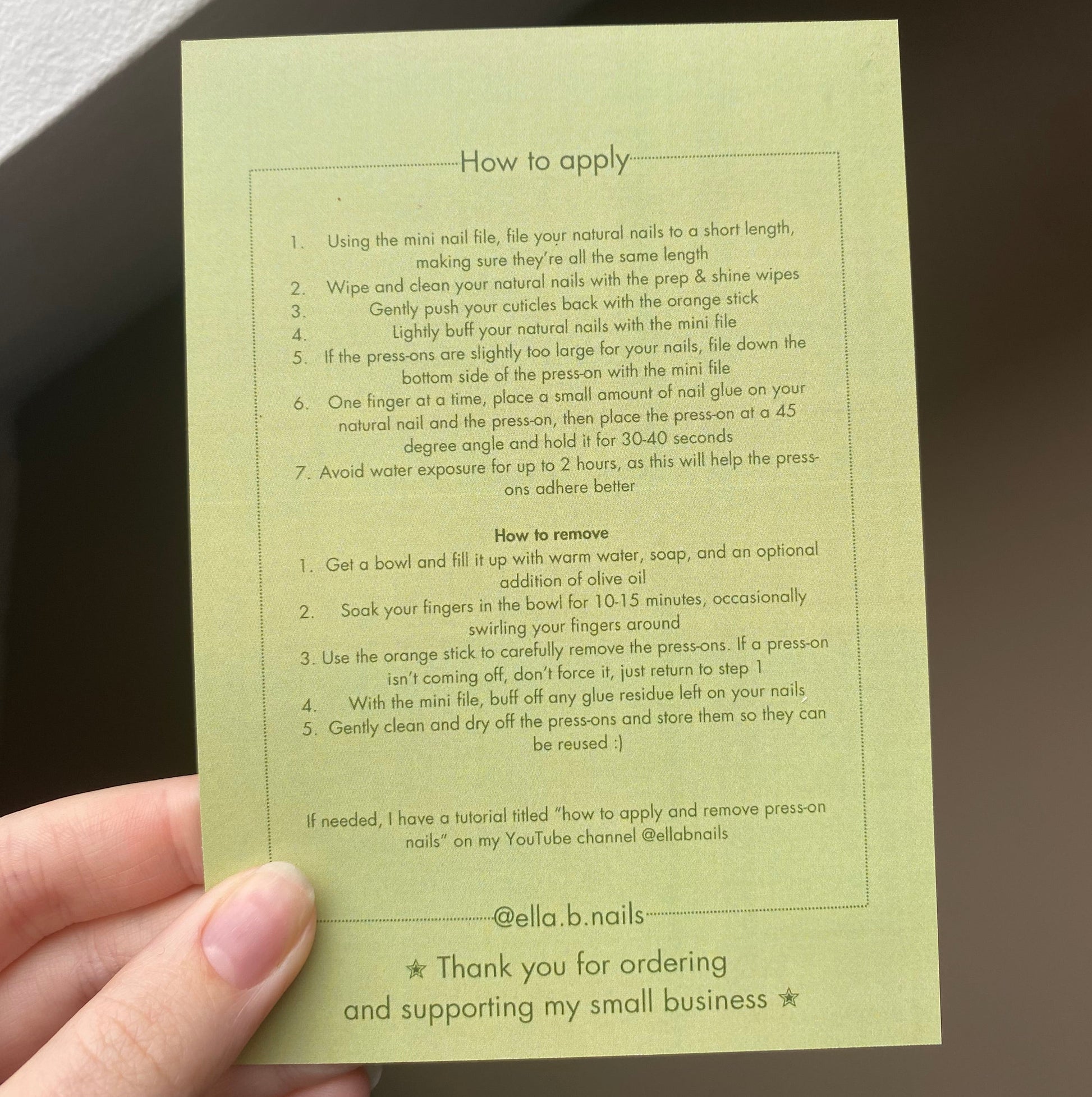 Please remember to measure your nail sizes carefully and multiple times, so you get the most accurate fit, I am not responsible for incorrect measurements and purchases cannot be refunded or returned. Also, keep in mind that there might be slight variations on sets as they're handmade.